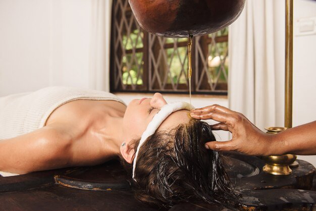 The Shirodhara massage is a blissful experience where a continuous stream of warm oil is poured onto the forehead, promoting deep relaxation, reducing stress, and enhancing mental clarity. A continuous stream of warm oil is poured onto the forehead promoting deep relaxation.